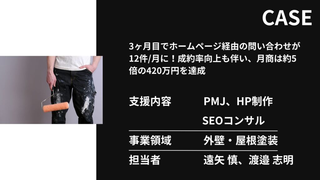 【PMJ】3ヶ月目でホームページ経由の問い合わせが12件/月に!成約率向上も伴い、月商は約5倍の420万円を達成