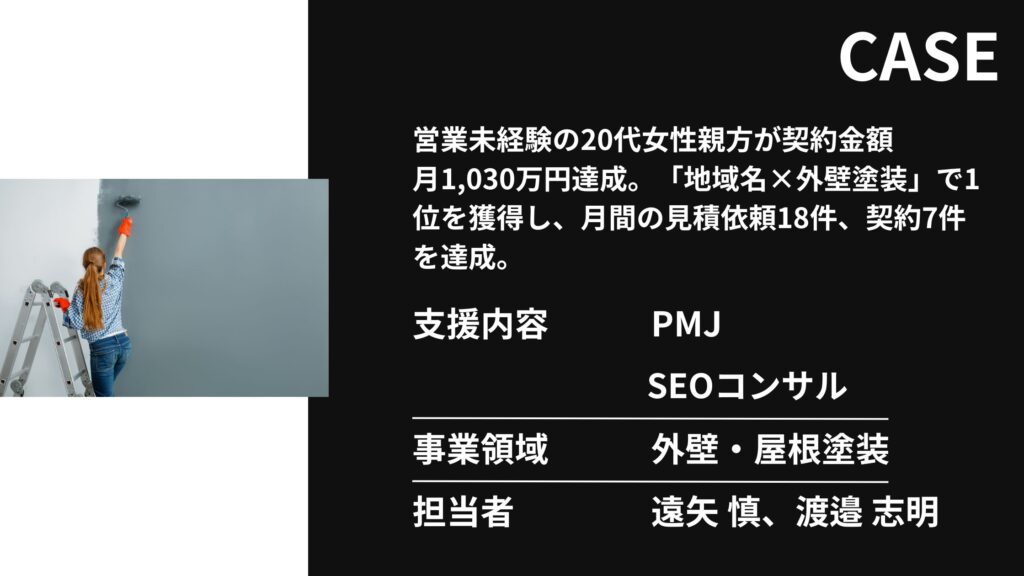 【PMJ】営業未経験の20代女性親方が契約金額月1,030万円達成。「地域名×外壁塗装」で1位を獲得し、月間の見積依頼18件、契約7件を達成