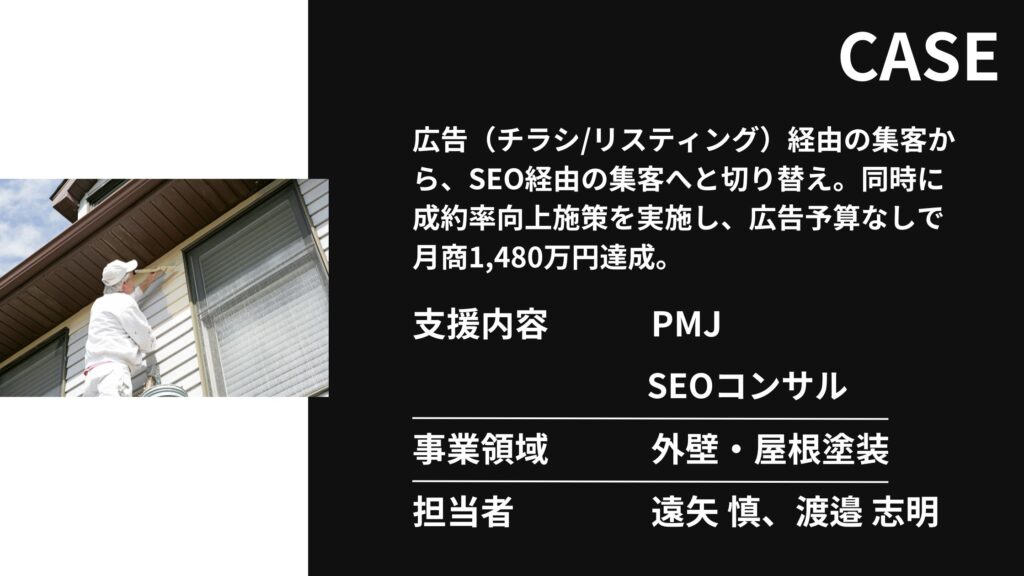 【PMJ】広告経由の集客から、SEO経由の集客へと切り替え。同時に成約率向上施策を実施し、広告予算なしで月商1,480万円達成。